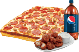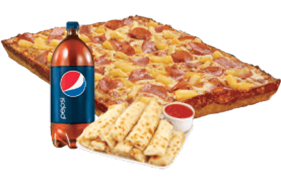 All day. Large round, 1 topping, breadsticks – no substitutes