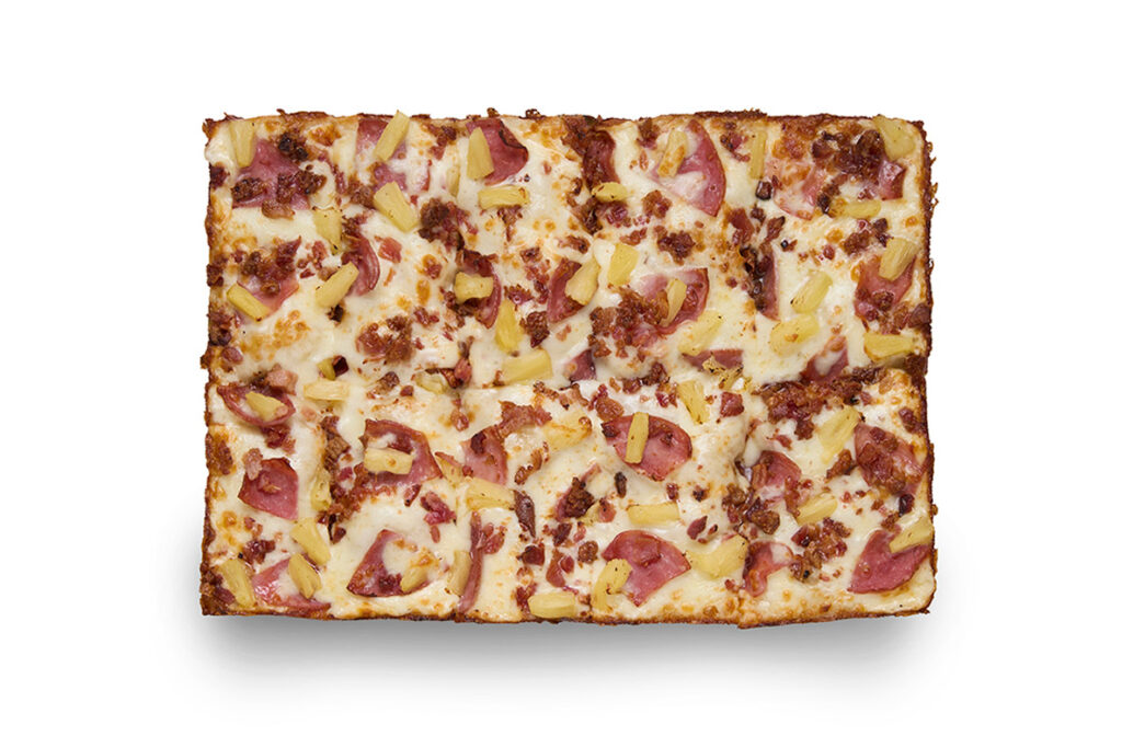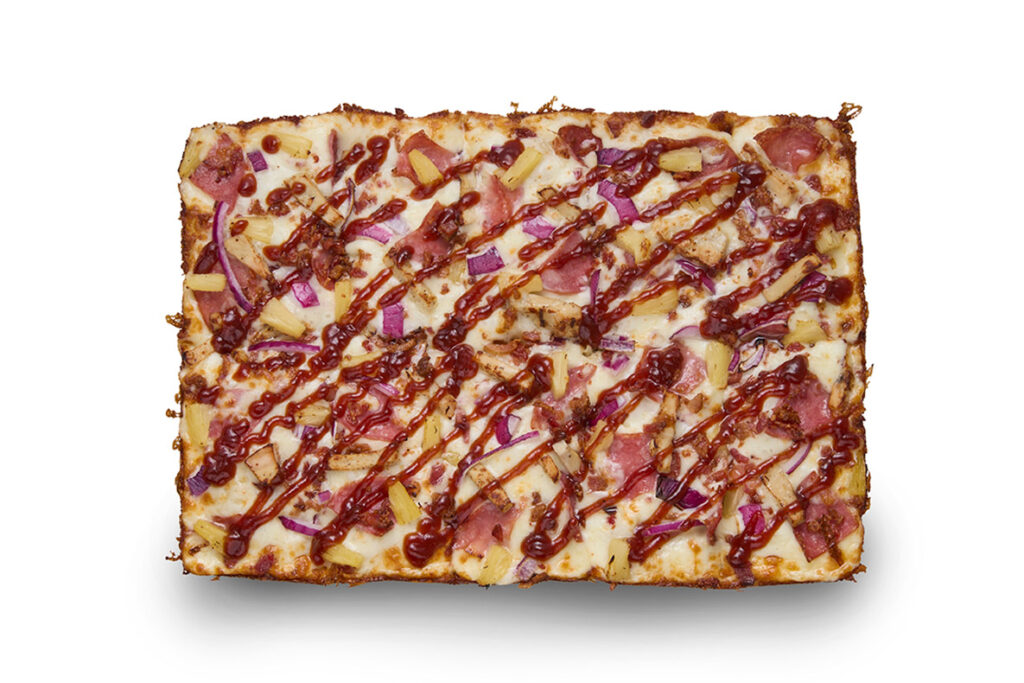 BBQ Sauce, Ham, Bacon, Grilled Chicken, Pineapple, Red Onions, and Cheese