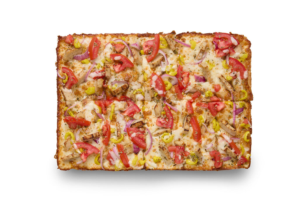 Grilled Chicken, Tomatoes, Red Onions, Mild Peppers, Garlic Butter, Oregano, Feta, and Mozzarella Cheese