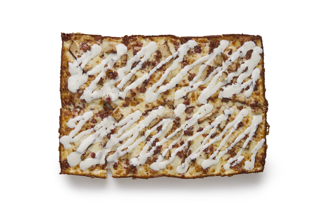 Bacon, lettuce, tomato, ranch, and mozzarella.